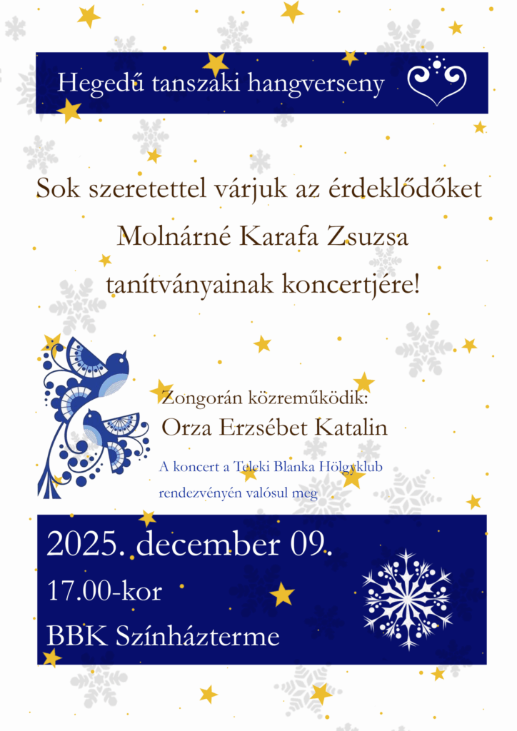 Horváth Tamara és Farkas Tamás növendékkoncertje 2025. 12. 08. 17.30-kor a BBK Színháztermében