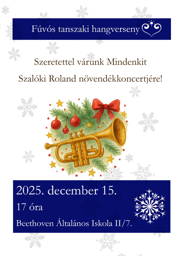 Szalóki Roland növendékeinek koncertje 12. 15-én, 17.00 órakor a Beethoven Általános Iskola II/7. termében